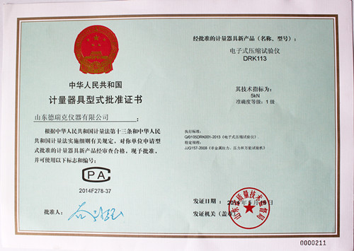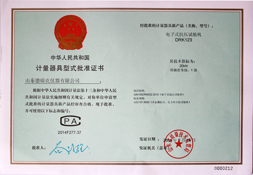 近日,德瑞克接到市局通知,在濟南市質(zhì)量技術(shù)監督局一樓計量器具型式許可證窗口領(lǐng)取到了電子拉力試驗機型式批準證書(shū)(證書(shū)編號2014F376-37),加上之前領(lǐng)取的電子式抗壓試驗機(證書(shū)編號2014F277-37)、電子式壓縮試驗儀(證書(shū)編號2014F278-37)的型式批準證書(shū),至此,德瑞克涉及的國家法定監管的計量產(chǎn)品已全部獲得證書(shū)。